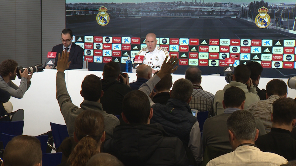 Imágenes del entrenador del Real Madrid, Zinédine Zidane, durante la rueda de prensa previa a la celebración del 'Clásico'.
