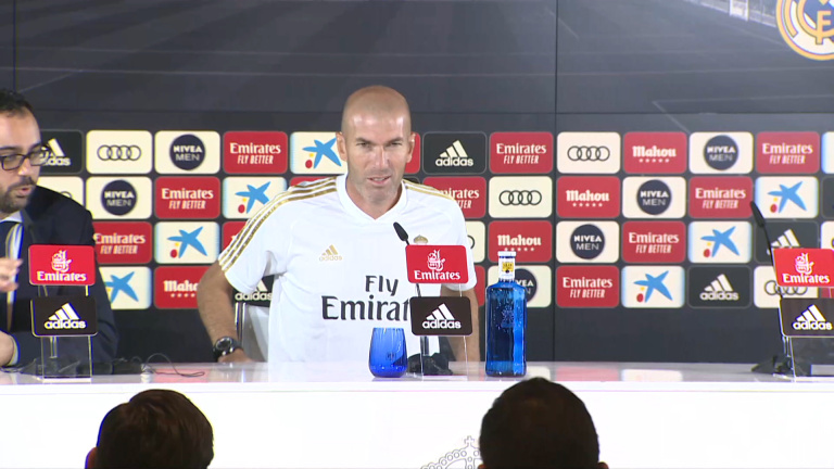 Imágenes del entrenador del Real Madrid, Zinedine Zidane, en la rueda de prensa previa al derbi.