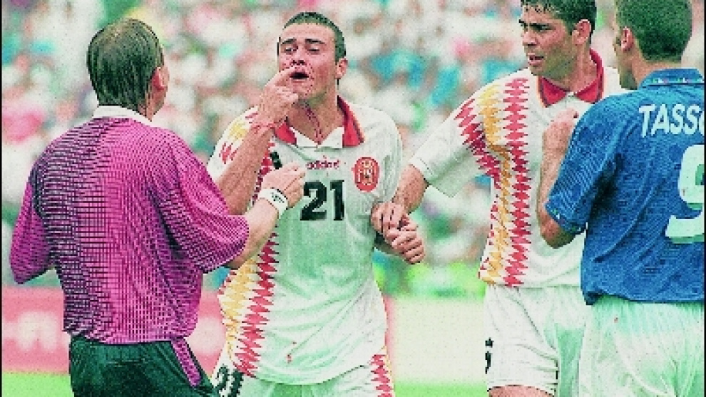 Han pasado casi tres lustros desde aquel episodio, pero la imagen permanece en la retina y se aviva cada vez que Italia se cruza en el camino de la selección española. Entonces, indefectiblemente, como si de una costumbre atávica se tratara, aparece el rostro de Luis Enrique, con la nariz rota, chorreando sangre, a punto de explotar de rabia. Acaba de recibir una codazo de Mauro Tassotti, un soberano penalti, y el árbitro ni se ha inmutado. Son los cuartos del Mundial de Estados Unidos y España acaba de claudicar (2-1), una vez más, ante Italia.