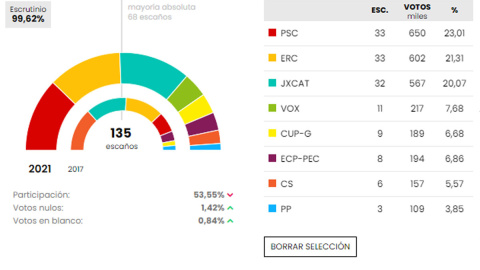 El PSC logra 33 escaños en las elecciones al Parlament de Cataluña con más del 96% escrutado y empata con ERC. Si bien, el bloque independentista suma 74 escaños, una holgada mayoría absoluta, con los 33 representantes del partido de Pere Aragonès, 32 de Junts y los 9 de la CUP. El PDeCAT se queda sin representación.