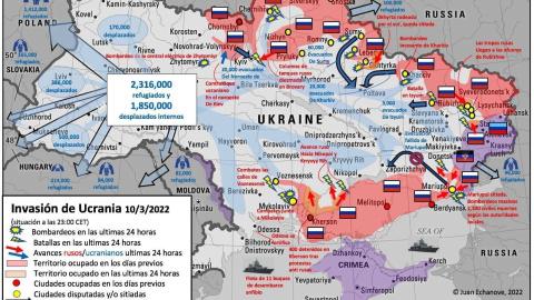 Se cumplen 16 días desde el inicio de la guerra en Ucrania. Las fuerzas ucranianas continúan resistiendo la ofensiva desde distintas direcciones mientras varios miles de civiles han podido ser evacuados gracias a los corredores humanitarios. La guerra ha provocado ya la huida de 2,5 millones de refugiados y otros dos millones de desplazados internos en Ucrania. La reunión entre los ministros de Exteriores de Rusia y Ucrania, Serguéi Lavrov y Dmitro Kuleba terminó este jueves sin más acuerdo que el de mantener abierto el diálogo mientras estrechaba el cerco sobre Mariúpol.