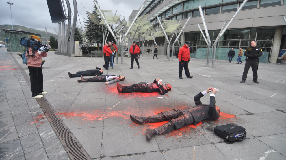 La denuncia también se ha sentido en los accesos al Palacio Euskalduna, el escenario elegido para esta reunión. Allí fuera, activistas del Movimiento de Objeción de Conciencia (KEM-MOC) volvieron a realizar una performance en la que se tiñeron de pintura roja, emulando sangre, y se arrojaron al suelo. La Ertzaintza, que estaba desplegada en la zona, les sacó a rastras.