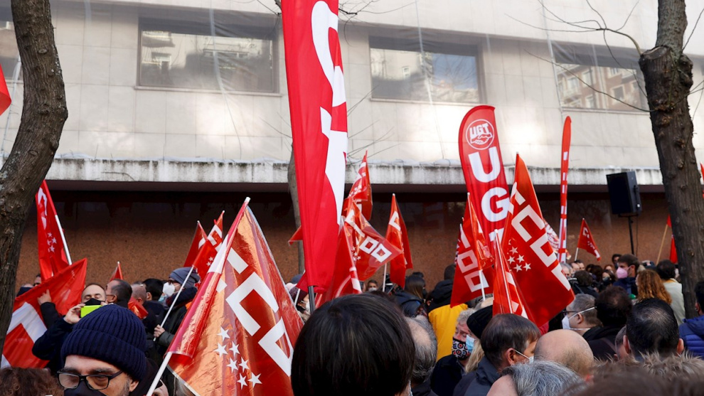 Centenares de personas, convocadas por la Unión General de Trabajadores (UGT) y Comisiones Obreras (CCOO), se han concentrado este jueves ante la sede de la CEOE en Madrid para reclamar a gritos el desbloqueo de la negociación de los convenios y una subida de salarios que minimice la pérdida de poder adquisitivo de los trabajadores.