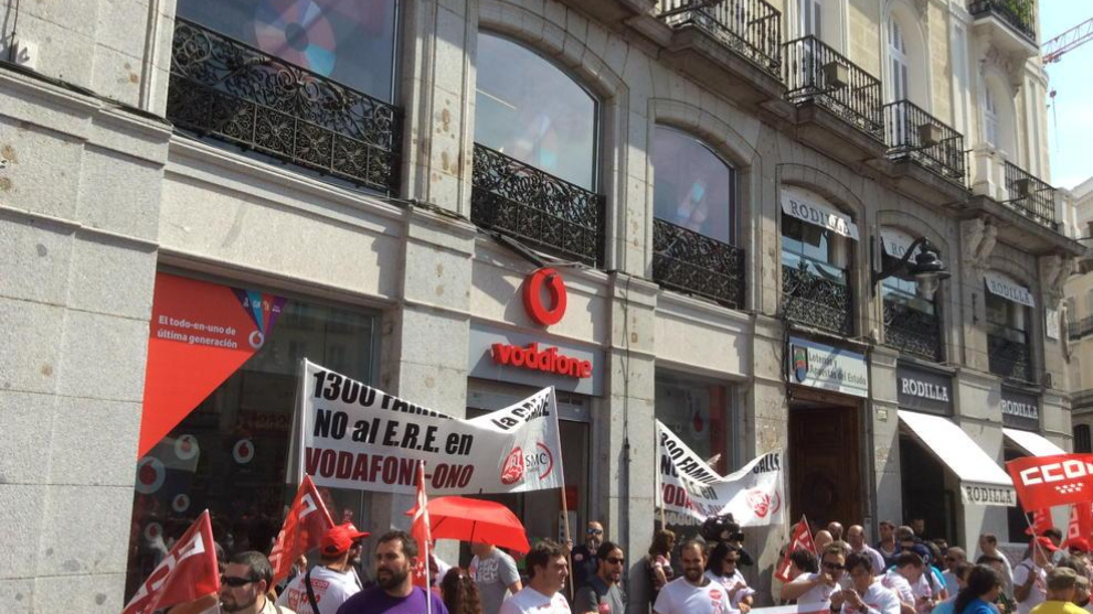 MADRID.- Cerca de 200 trabajadores de Vodafone se han concentrado este sábado, movilizados por los sindicatos, en la Puerta del Sol de Madrid para protestar contra el Expediente de Regulación de Empleo (ERE) planteado por la compañía tras la compra de ONO, que afecta cerca de 1.300 empleados.