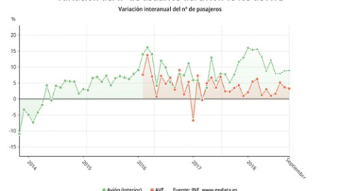 El número de viajeros que optó por viajar en avión para desplazarse por el interior del país aumentó un 9% en septiembre respecto al mismo mes de 2017, mientras que los que eligieron los trenes AVE subieron un 3,3%, según datos del Instituto Nacional de Estadística (INE).