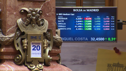 Imágenes de la bolsa de Madrid donde el Ibex 35 rebotaba un 0,9% en la media sesión de este jueves, después de haber amanecido plano, un avance que llevaba al selectivo madrileño a romper el umbral de los 9.500 puntos, nivel en el que no ha logrado asentarse desde el pasado 29 de agosto.