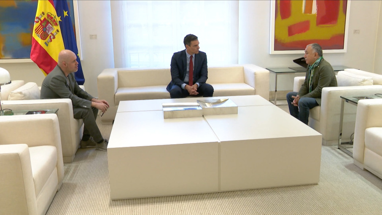 El presidente del Gobierno, Pedro Sánchez, ha recibido este miércoles en el Palacio de la Moncloa a los secretarios generales de UGT, Pepe Álvarez, y CCOO, Unai Sordo. En el encuentro, los sindicatos han entregado la Declaración de la Confederación Europea de Sindicatos sobre el COVID-19 y la estrategia de recuperación, en la que se reclama una respuesta europea contundente para prevenir y contener la recesión económica, el desempleo y la pobreza, así como para reconstruir el proyecto europeo.