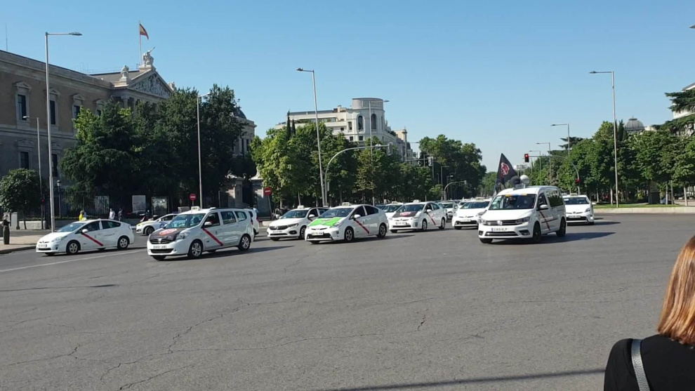 Los taxistas se han concentrado con sus coches por las calles del centro de Madrid para pedir una regulación del sector del taxi en la capital para la nueva normalidad.