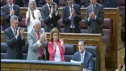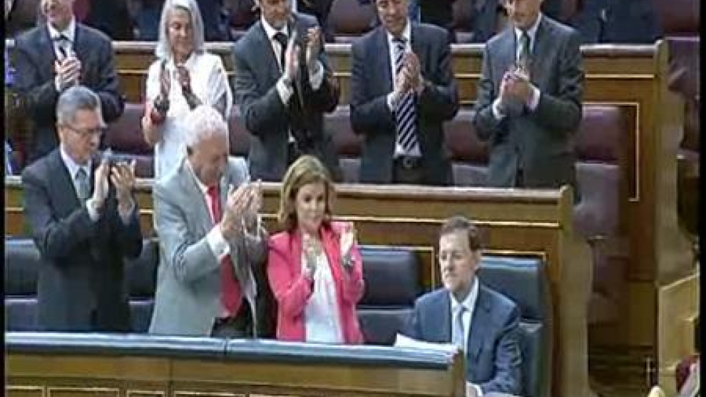 Aplausos. El presidente del Gobierno, Mariano Rajoy, ha recibido una lluvia de aplausos al terminar su intervención en la que ha anunciado un nuevo 'tijeretazo' por valor de 65.000 millones de euros. Ha sido la inmediata reacción de la bancada popular que en pie le ha dedicado una cerrada ovación a su líder que ha durado 50 segundos. Se trata de un apoyo manifiesto de los suyos tras anunciar un duro recorte.