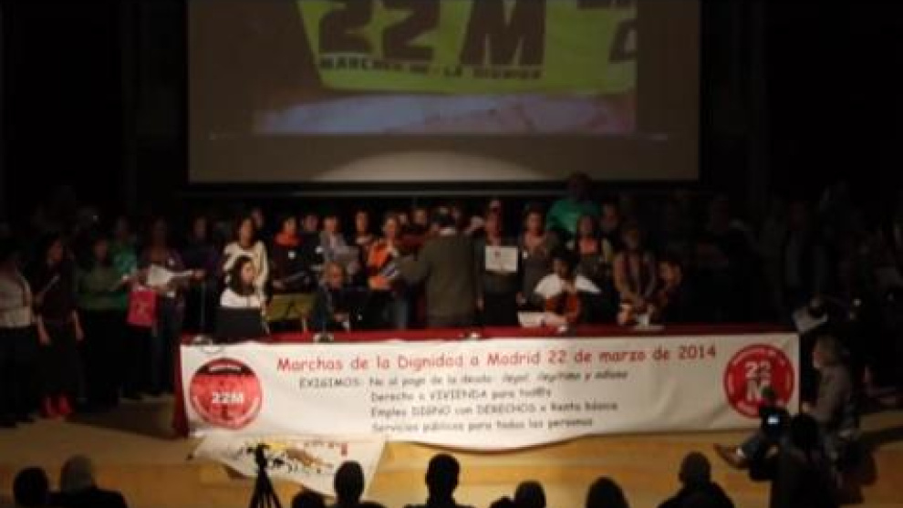 Uno de los temas interpretados por la orquesta solfónica del 15-M este sábado, durante el acto de presentación de las Marchas de la Dignidad que llegarán a Madrid el próximo 22 de marzo, para clamar contra los recortes sociales o el pago de la "deuda ilegítima".A. López de Miguel