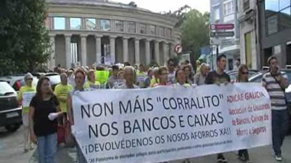 "Que devuelvan lo robado. No al corralito" ha sido el lema de la manifestación de afectados por las participaciones preferentes que este sábado ha recorrido A Coruña.