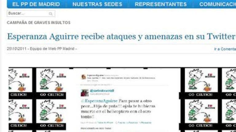 Insultos a través de Twitter. La presidenta de la Comunidad de Madrid, Esperanza Aguirre, ha denunciado que adversarios políticos le desean la muerte a través de su cuenta en la red social Twitter.