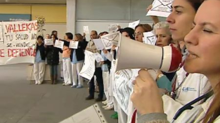 Con el lema "Más batas blancas y menos sobres negros", médicos y enfermeros de los hospitales madrileños han vuelto a concentrarse hoy a las puertas de los centros en contra del plan de privatizaciones de la Comunidad de Madrid. Denuncian que se está desviando dinero público a empresas privadas que se harán con la gestión de los centros.