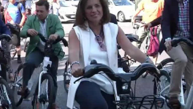 La alcaldesa de Madrid, Ana Botella, ha recorrido las calles de Madrid en una de las nuevas bicicletas eléctricas, que desde hoy forman parte del nuevo sistema público de bicicleta 'cien por cien' eléctrica, que estará operativo todos los días del año durante 24 horas. Este servicio arranca con una flota de 1.560 bicis y 3.120 anclajes distribuidos en 123 estaciones distribuidas en los distritos de Centro, Salamanca, Arganzuela, Retiro, Moncloa-Aravaca y Chamberí.