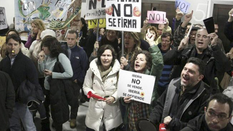 Un centenar de trabajadores de Iberia se han concentrado hoy frente al rectorado de la Universidad Autónoma de Madrid (UAM), lugar donde ha tenido lugar una reunión entre sindicatos y dirección de la aerolínea, para exigir que no se firme la propuesta si no se garantiza futuro a la compañía. Parte de los manifestantes han subido, pasadas las 10, a la planta quinta del edificio donde se celebraba el encuentro, protagonizando una cacerolada, acompañada de ruidos de silbatos.