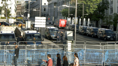 Imágenes de esta mañana del dispositivo policial que rodea el Congreso de los Diputados. Decenas de furgones de policía custodian la entrada y alrededores del Congreso.