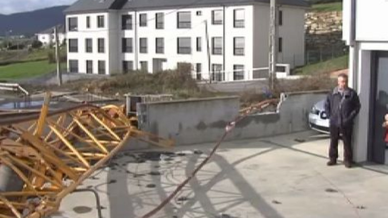 Vientos de más 160 kilómetros por hora tumban una enorme grúa en Foz, en la comarca lucense de A Mariña, muy cerca de una casa. Daños también en el puerto pesquero de Burela, con las puertas de metal casi arracandas en las naves de resdes. Los destrozos por un temporal extremo que no parace acabar nunca se extienden por toda la cornisa cantábrica.