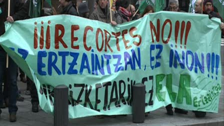 Delegados de ELA-Ertzaintza y agentes fuera de servicio se han concentrado este jueves ante la comisaría de Zabalburu en Bilbao para protestar contra los recortes en el sector público, según ha informado el responsable de la Ertzaintza en el sindicato ELA, Jesús Mari Larramendi.