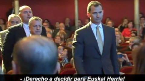 Al grito de "¡Derecho a decidir para Euskal Herria!". Así han recibido en Bilbao al Príncipe cinco partidarios del derecho a decidir, entre los que había tres parlamentarios de Bildu: Maribi Ugarteburu, Unai Urruzuno y Diana Urrea. Ha sido en la entrega de los Premios Novia Salcedo en el Teatro Arriaga. Llevaban camisetas naranjas con el lema en varios idiomas. Los asistentes al acto los han despedido con abucheos cuando han abandonado la sala, sin mayores incidentes.