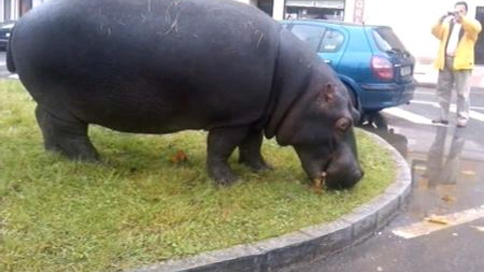 Este fin de semana no lo olvidarán en Sada, La Coruña; atónitos estaban los vecinos cuando vieron ante sus narices un hipopótamo comiendo plácidamente la hierba de una rotonda.