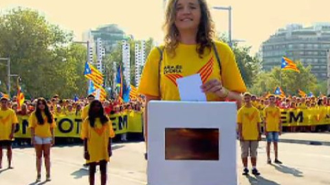 Esta tarde las calles de Barcelona acogen la gran manifestación soberanista convocada por la Asamblea Nacional de Cataluña y Omnium con motivo de la Diada, y que este año tiene un carácter especialmente reivindicativo, como la cadena humana del año pasado, pero con la vista puesta en la consulta del 9N. A las 17.14 horas en la gran V entre Glòries, Diagonal y Gran Vía ha habido un voto simbólico a cargo de una joven en una urna ubicada en el escenario principal. Con este acto a esta hora se ha querido recordar el asedio de Barcelona en 1714, que simboliza el fin de las libertades de los catalanes para los nacionalistas.
