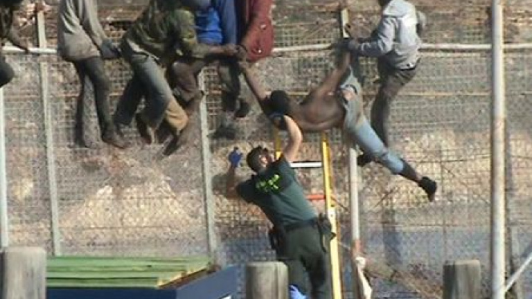En la valla de la frontera de Melilla hoy se ha producido una escena dramática que muestra las lamentables condiciones en las que llegan los inmigrantes que pretenden entrar en España de manera ilegal. Al límite de sus fuerzas, un joven de un grupo de subsaharianos, ha sido rescatado por la Guardia Civil, después de pasar varias horas encaramado a la valla hasta el punto de perder el conocimiento. También se ha podido ver a la Guardia Civil haciéndoles llegar botellas de agua. -Redacción-