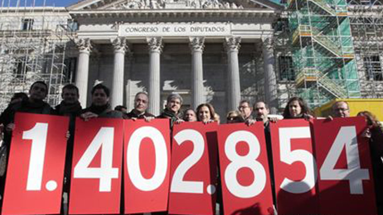 Madrid D.P. Manifestación frente al Congreso de los Diputados Declaraciones: Ada Colau, Portavoz de la Plataforma de Afectados por la Hipoteca La Plataforma de Afectados por la Hipoteca se manifiesta a las puertas del Congreso de los Diputados para exigir que acepten la Iniciativa Legislativa Popular sobre desahucios que ha sido respaldada por 1.402.854 firmas y tiene el apoyo mayoritario de la ciudadanía. “Hoy lo que se va a debatir hay que aclararlo es la tramitación de esta iniciativa, es decir, no se vota el contenido, sino simplemente el hecho de que se pueda debatir. Ya podemos anunciar oficialmente que se han recogido más de 1.400.000 firmas. Para acabar con esta barbaridad y para equipararnos a los países de nuestro alrededor, exigimos esta dación en pago y además con efecto retroactivo. Hoy sería inconcebible que aquí en el Congreso, no se admita a trámite, es decir, no se acepte debatir este esfuerzo de la ciudadanía, sino para qué existen las ILP. Si a pesar de eso el Congreso no acepta debatir de esto, realmente tendremos un problema de democracia”.