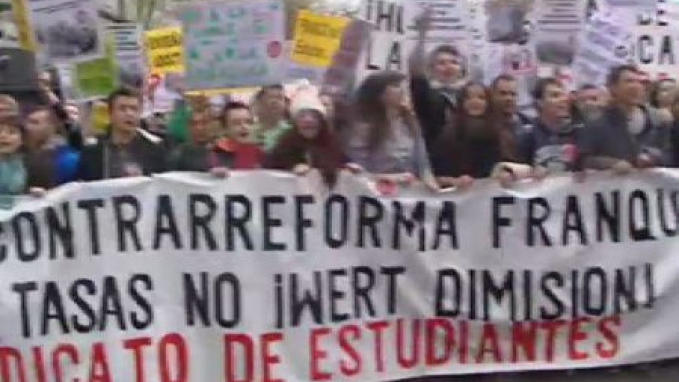 Este mediodía ha comenzado la manifestación de estudiantes por la calle Alcalá frente a la sede del Ministerio de Educación para protestar contra los recortes y la aplicación de la LOMCE del ministro Wert. De momento, no se han producido incidentes.