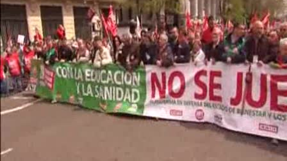 Justo un mes después de la huelga general, nueva protesta en la calle contra los recortes del gobierno. Decenas de manifestaciones han recorrido este domingo varias ciudades españolas. La marcha en Madrid ha sido, a pesar de la lluvia, la más multitudinaria. El acto estaba convocado por plataforma Social en Defensa del Estado del bienestar con el impulso de los sindicatos y el lema "Con la educación y la sanidad no se juega". El Partido Socialista e Izquierda Unida se han unido a la llamada. Los manifestantes han protestado por la exclusión de la sanidad a los inmigrantes sin residencia legal, el copago farmacéutico según la renta, la reforma laboral, la subida del IRPF y el posible aumento también del IVA.