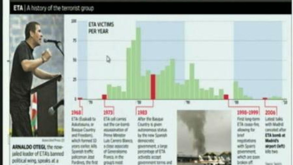 Arnaldo Otegui asegura que ETA está preparada para dejar la violencia y para dar garantías de diálogo. Así lo ha asegurado en una entrevista al diario "The Wall Street Journal". El periódico titula: "El grupo vasco hace una oferta de paz". Continúa diciendo que, según el líder de Batasuna, ETA y su entorno están listos para abandonar la violencia. Sin embargo, no ha precisado si habrá pronto un comunicado de la organización terrorista. Otegui ha respondido a un cuestionario que le han enviado a prisión.