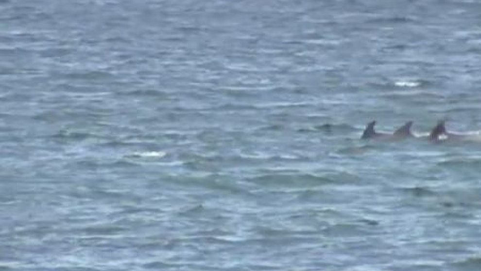 Esta mañana los vecinos de Riazor se han levantado con nuevos compañeros, una familia de delfines. Los movimientos y juegos de los cetáceos han llamado la atención de quienes paseaban por la orilla a primera hora. A mediodía los delfines continuaban en la playa.