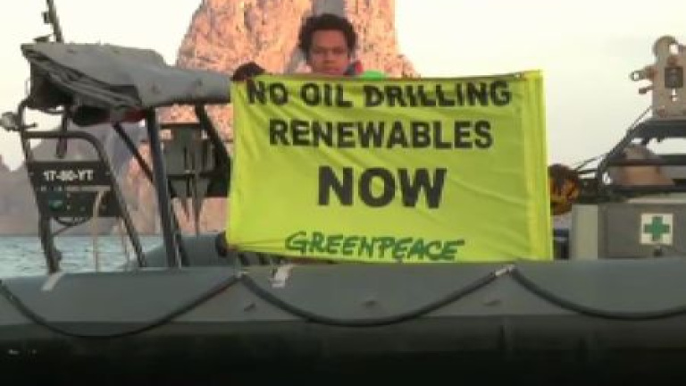 La organización ecologista Greenpeace ha tomado hoy la costa de Ibiza. Con el mítico Rainbow Warrior al frente, han protestado así contra las prospecciones petrolíferas en aguas de Baleares y Canarias. Aunque la industria defiende que los riesgos son casi inexistentes, los activistas aseguran que suponen un grave peligro para la fauna marina.