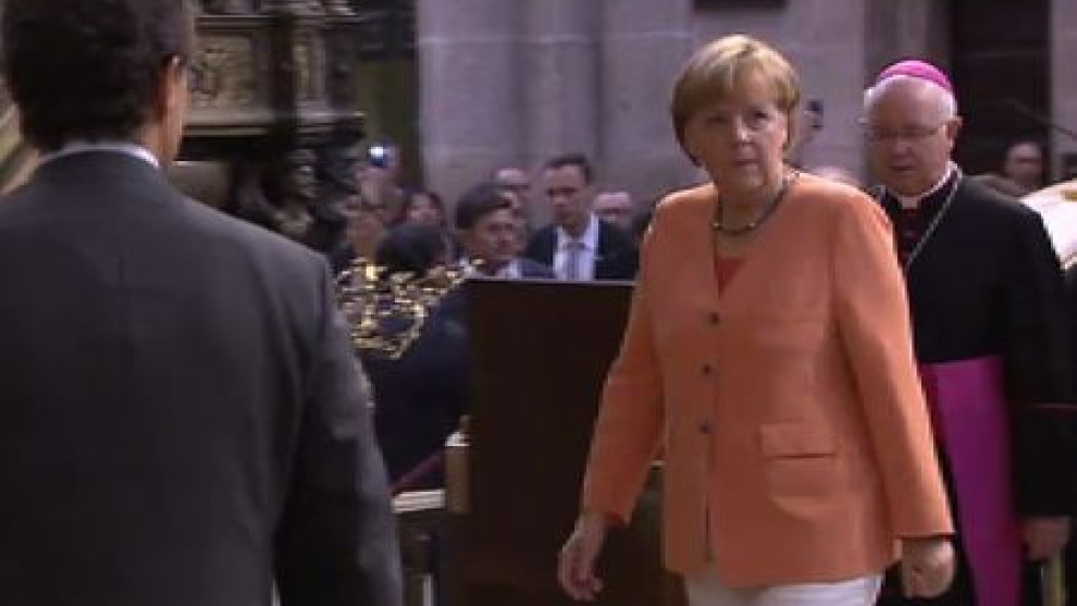 El presidente del Gobierno y la canciller alemana han realizado una breve visita a la catedral de Santiago. Angela Merkel y Mariano Rajoy han cambiado el programa fijado para la segunda jornada de su cumbre en Santiago. Ambos mandatarios tenían previsto visitar el templo después de una rueda de prensa tras la reunión privada que han mantenido esta mañana. Sin embargo, han decicido adelantar la visita y posponer el encuentro con los medios. -Redacción.-