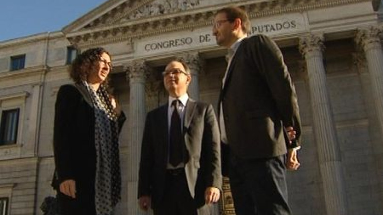 Esta mañana han llegado al Congreso de los Diputados los representantes del Parlamento catalán que intervendrán esta tarde en el Congreso de los Diputados para defender la propuesta de convocar una consulta al pueblo catalán sobre el soberanismo.Jordi Turull (CiU), Marta Rovira (ERC) y Joan Herrera (ICV-EUiA) llegan a la cámara baja convencidos de que obtendrán un no por respuesta, pero convencidos de la utilidad de presentar al Congreso sus argumentos.