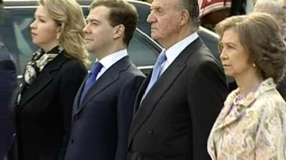 El presidente ruso, Dimitri Medvédev ha iniciado su visita a España con una recepción real. Don Juan Carlos y Doña Sofía han recibido al mandatario y a su mujer en el Palacio Real del Pardo. Tras un desfile de la Guardia Real los Reyes les han ofrecido un almuerzo en La Zarzuela.Es la primera visita a España del presidente de Rusia. El Gobierno español está convencido de que esta visita constituirá "un paso adelante" en las relaciones bilaterales, como reflejará la firma de una Declaración de Asociación Estratégica, que elevará el marco institucional de la interlocución e irá más allá del Tratado de Amistad y Cooperación de 1994. Además de esa declaración, los dos gobiernos aprovecharán para firmar hasta cinco acuerdos de cooperación, una de ellos para permitir el traslado por territorio ruso de equipos y personal militar español que vaya hacia Afganistán. Mañana está previsto que Dimitri Medvédev se reúna con el presidente de España, José Luis Rodríguez Zapatero.