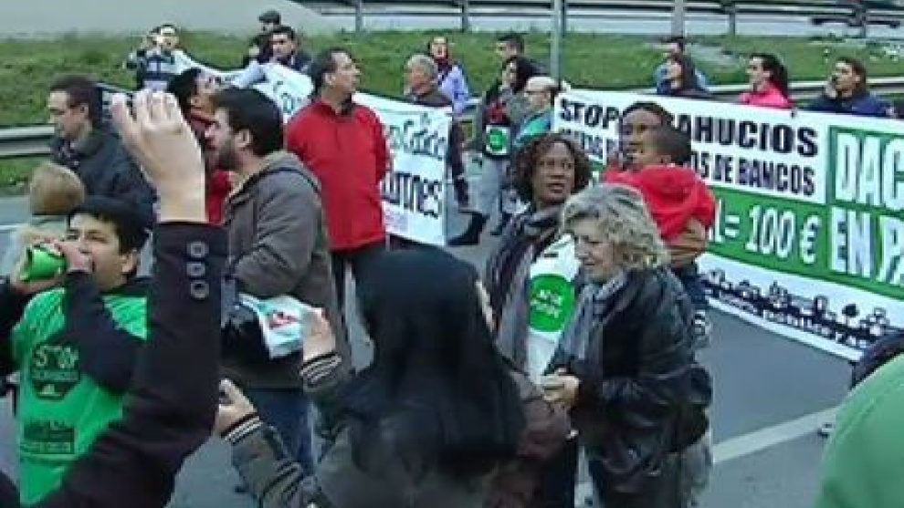Romería de protesta contra los desahucios que consiguió cortar el tráfico a uno de los accesos de Barcelona. Son vecinos del barrio barcelonés de Ciudad Meridiana, conocido ya con el sobrenombre de villadesahucios porque es donde más hay de toda España. Durante la protesta rodearon un edificio de pisos de protección oficial que está casi vacío.