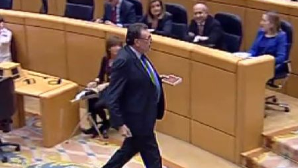 Un senador de CiU regala un libro a Rajoy durante la sesión de control