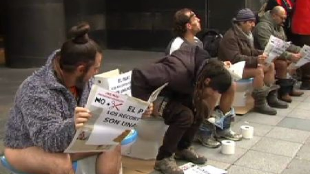 Un colectivo social de Bilbao ha protestado hoy de forma muy gráfica: sentados en inodoros. Aseguran que las políticas sociales están desapareciendo y que el estado del bienestar se va por el desagüe. Aseguran que los recortes en politicas sociales en puja cada vez a más gente a la pobreza en nuestro país.