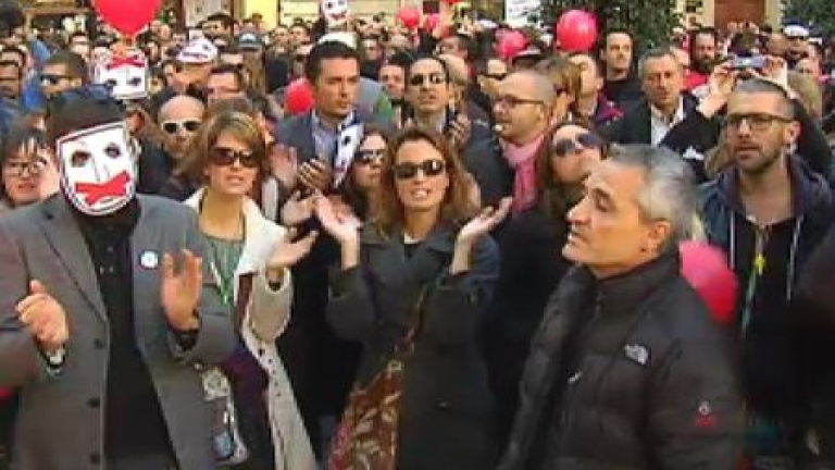 Los trabajadores de Canal 9 siguen presentándose a todos los actos que tiene el presidente de la Generalitat. Una protesta en la que han vuelto a pedir la dimisión de Alberto Fabra, que presidía un acto por las víctimas del terrorismo. Decenas de policías han acordonado la zona para evitar incidentes.