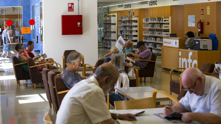 En la planta baja de la Biblioteca de Nou Barris, un grupo de jubilados pasa las páginas de diarios y revistas al compás de los minutos. A su lado, en una pequeña sala separada por estanterías, pueden verse los vestigios de las primeras televisiones que el equipamiento adquirió: las pantallas han desaparecido, pero los pequeños agujeros donde se conectaban los auriculares siguen allí. Chusa es una de las señoras que se hallan en la sala. Es viuda y sus hijos viven fuera de la ciudad. "No conozco a nadie de los que estamos aquí pero, de alguna forma, nos hacemos compañía. Vengo desde el primer día que abrieron, debe de hacer más de 20 años", exclama.