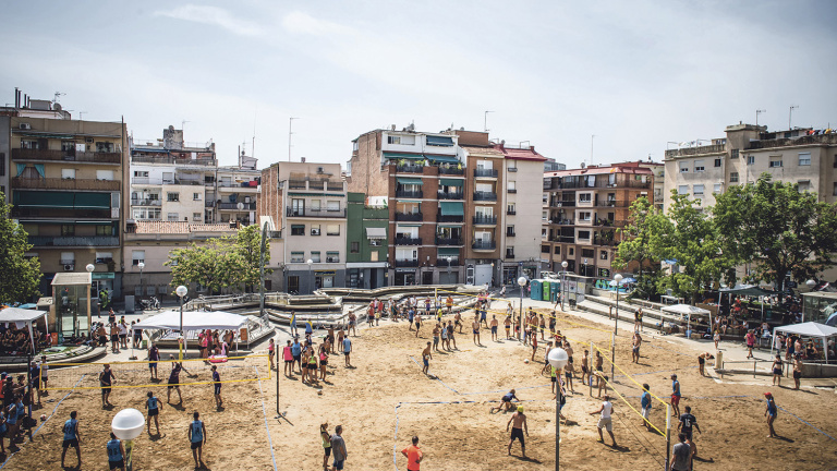 El sol descarga con fuerza. Pero los remojones y los pies descalzos sobre la arena húmeda aligeran algo el bochorno. Los niños corretean de un lado para otro y unos pocos chavales, ataviados con bañadores cortísimos, se emplean a fondo con en el vóley. La estampa es digna de cualquier costa. Pero se da en un paraje extraordinario: una plaza dura en un barrio de interior de Barcelona.