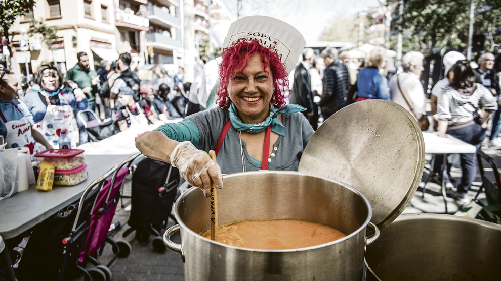 La degustación de sopas, que dura apenas una hora, es el clímax de un esfuerzo colectivo que, a lo largo de todo el año, moviliza a un montón de gente, en su gran mayoría voluntarios. Lo organiza la Xarxa 9 Barris Acull, una red de 80 entidades que desde 2001 trabaja para que los vecinos de origen diverso se incorporen a la vida comunitaria. "El barrio andaba cambiando de color", recuerda Lourdes Ponce, portavoz de la red. "Supimos de los disturbios racistas en El Ejido, en el año 2000, y no queríamos que una zona tan cohesionada socialmente como la nuestra pudiese desestabilizarse por algún episodio de ese tipo", recuerda. Tras reunirse en el Casal de Barri –en la plaza Ángel Pestaña, una especie de plaza mayor de la Prosperitat–, el tejido asociativo se puso manos a la obra. Semanas después, ya le estaban pidiendo al párroco de Santa Engracia que cediese esta iglesia de Prosperitat para ayudar a extender el encierro de migrantes que desde hacía unos días pedían papeles para todos en la iglesia de Santa Maria del Pi.
