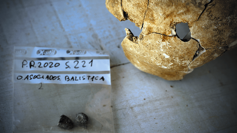 Un cráneo con un balazo y los proyectiles asociados a la víctima.- JUAN MIGUEL BAQUERO