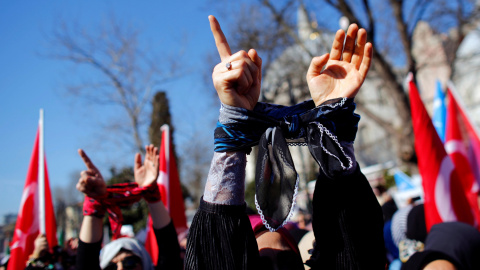 Fotogalerías Este artículo se publicó hace 7 años.El Día de la Mujer en el mundoTamaño de letraColor de fondoComparteComentaPúblico 08/03/2019 16:06-Actualizado a08/03/2019 16:08Tamaño de letraColor de fondoComparte0Comenta Una mujer con las manos atadas durante una protesta solidaria por las mujeres sirias en Estambul. REUTERS/Murad SezerPublicidad Una mujer sostiene una pancarta durante la marcha por el Día Internacional de la Mujer en Atenas, Grecia. REUTERS/Costas Baltas El símbolo feminista es pintado en un ventanal de la Danner Foundation's house en Copenhague Ritzau Scanpix/Nils Meilvang./REUTERS Un grupo de mujeres cuelga un cartel en la estatua de la Plaza de la República en la que se puede leer: "Plaza de las brujas". REUTERS/Philippe Wojazer Activistas ucranianas marchan por la igualdad y contra la violencia machista en Kiev. REUTERS/Gleb Garanich.Publicidad Mujeres durante la marcha por Berlín. REUTERS/Hannibal Hanschke Una mujer yazidista participa en una ceremonia en el templo de Lilash para conmemorar la muerte de una mujer que fue asesinada por militantes del ISIS, en el norte de Irak. REUTERS/Ari Jalal Activistas feministas en Tirana, Albania. REUTERS/Florion GogaComparteComentarios de nuestros socias/os¿Quieres comentar?Para ver los comentarios de nuestros socias y socios, primero tienes que iniciar sesión o registrarte. Escribe tu comentarioRecuerda las normas de la comunidad.Enviar Descartar
