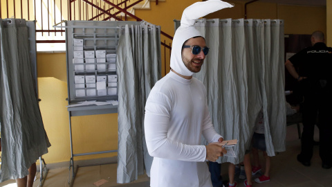 Fotogalerías Este artículo se publicó hace 10 años.La jornada electoral en imágenesTamaño de letraColor de fondoComparteComentaPúblico 26/06/2016 11:20-Actualizado a26/06/2016 19:42Tamaño de letraColor de fondoComparte0Comenta Un hombre disfrazado de espermatozoide acude a votar en un colegio electoral de Madrid/REUTERSPublicidad Patxi López, presidente del Congreso durante los tres meses de la legislatura anterior, votando en Bilbao esta mañana/EFE Alberto Garzón, número 5 por Unidos Podemos y líder de Izquierda Unida ha sido uno de los primeros candidatos en ir a votar poco antes de las 10 de la mañana/REUTERS Una monja deposita su voto en un colegio del barrio de Aravaca, en Madrid/EFE Manuela Carmena, alcaldesa de Madrid, votando en el colegio IES Conde de Orgaz, en el barrio de Hortaleza esta mañana/EFEPublicidad Papeletas con todas las formaciones candidatas al Congreso y al Senado a la apertura de un colegio electoral/REUTERS Arnaldo Otegi, líder de la izquierda abertzale, votando en un colegio electoral de la provincia de Guipuzcoa/EFE Los votos por correo han llegado a cada colegio electoral esta mañana y serán los últimos en depositarse en las urnas una vez cerrado el plazo de votación/REUTERSPublicidad Una mujer va a depositar sus votos en las urnas correspondientes ante la Presidenta de una de las mesas electorales/REUTERS Mariano Rajoy, presidente en funciones, acude a votar a un colegio electoral del barrio madrileño de Aravaca, poco antes de las 11 de la mañana/EFE Albert Rivera, líder de Ciudadanos, ha acudido a votar a un colegio electoral de Barcelona/Twitter Ciudadanos La vicepresidenta de España en funciones, y número dos del Partido Popular, Soraya Sáenz de Santamaría, votando en un colegio de Madrid/EFE Pedro Sánchez, líder del Partido Socialista, votando esta mañana en Pozuelo de Alarcón, Madrid/EFEPublicidad Pedro Sánchez hablándole al oído a su mujer, Begoña Gómez, esperando a votar/EFE Así de lleno se encuentra el colegio electoral en Pamplona. Según datos oficiales, entre las 11 y las 14 horas, es cuando más gente acude a votar/EFEPublicidad Ada Colau, alcaldesa de Barcelona deposita su voto en un colegio electoral de Barcelona/EFE Pablo Echenique, secretario de organización de Podemos y diputado en las Cortes de Aragón, acude a votar en Zaragoza/EFE Pablo Iglesias, líder de la coalición Unidos Podemos, votando en Vallecas, Madrid, junto a su número dos, Íñigo Errejón/EFEPublicidad Jorge Fernández Díaz, ministro de Interior en funciones y cabeza de lista por Barcelona, votando en un colegio electoral de esa misma ciudad/EUROPA PRESS La presidenta andaluza y secretaria general del PSOE-A, Susana Díaz, ejerce su derecho al voto en un colegio electoral del barrio de Triana, en Sevilla/EFE Un invidente, Francisco Moreno, vota con la ayuda del sistema Braille en Logroño/EFE Cristina Cifuentes, presidenta de la Comunidad de Madrid, acude a votar en el distrito de Moncloa, en Madrid/EFEPublicidad Urnas bastante llenas en un colegio electoral de San Sebastián. A las 14 horas, la participación era del 36,87% en España/EFE Una pareja se prepara para votar junto a su perro en Pola de Siero. REUTERS/Eloy Alonso Un niño vestido de Batman deposita el voto de su madre en Pola de Siero. REUTERS/Eloy AlonsoComparteEtiquetasEleccionesElecciones GeneralesComentarios de nuestros socias/os¿Quieres comentar?Para ver los comentarios de nuestros socias y socios, primero tienes que iniciar sesión o registrarte. Escribe tu comentarioRecuerda las normas de la comunidad.Enviar Descartar