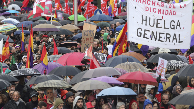 Fotogalerías Este artículo se publicó hace 11 años.Las Marchas de la Dignidad vuelven a tomar MadridTamaño de letraColor de fondoComparteComentaPedro González de la Calleja21/03/2015 22:17Tamaño de letraColor de fondoComparte0Comenta Miles de participantes en las Marchas por la Dignidad con sus paraguas han inundado la Plaza de Colón, donde han confluido las nueve columnas procedentes de todas las comunidades autónomas. EFE/BallesterosPublicidad Una de las nueve columnas que integran las Marchas de la Dignidad, procedentes de todas las comunidades autónomas y formadas por cientos de manifestantes, camino de la madrileña Plaza de Colón para protestar contra las consecuencias de las políticas de austeridad aplicadas durante la crisis. EFE/Ballesteros Dos participantes en las Marchas por la Dignidad tras una de las pancartas en la Plaza de Colón. EFE/Ballesteros Participantes en las Marchas por la Dignidad pasan ante varios policiales en la Plaza de Colón, donde han confluido las nueve columnas procedentes de todas las comunidades autónomas. EFE/Ballesteros Un manifestante sostiene una imagen del presidente del Gobierno, Mariano Rajoy, crucificado, durante la concentración de las Marchas de la Dignidad en la madrileña Plaza de Colón. REUTERS/Sergio PerezPublicidad Un hombre pasa junto a las furgonetas policiales desplegadas en la Calle Goya, junto a la Plaza de Colón, punto de llegada de las Marchas por la Dignidad. EFE/Ballesteros Miles de participantes en las Marchas por la Dignidad han llegado hasta la Plaza de Colón, donde han confluido las nueve columnas procedentes de todas las comunidades autónomas, para protestar contra las consecuencias de las políticas de austeridad. EFE/Ballesteros Miles de participantes en las Marchas por la Dignidad con sus paraguas han llenado la Plaza de Colón, donde han confluido las nueve columnas procedentes de todas las comunidades autónomas, para protestar contra las consecuencias de las políticas de austeridad. EFE/BallesterosPublicidad Una mujer coloca unas pancartas en un arbusto durante las Marchas de la Dignidad. REUTERS / Sergio Pérez Un manifestante protesta contra la Ley Mordaza, durante la concentración en la Plaza de Colón de las Marchas de la Dignidad. REUTERS/Sergio Perez Despliegue policial en Gran Vía ante los destrozos que varios integrantes de grupos radicales han realizado en mobiliario urbano en el centro de Madrid, al término de las Marchas por la Dignidad. EFE/Ballesteros Despliegue policial en uno de los acceso a la Puerta del Sol ante los destrozos que varios integrantes de grupos radicales han realizado en mobiliario urbano en los alrededores de la calle Montera, en el centro de Madrid, al término de las Marchas por la Dignidad. EFE/Ballesteros Alrededor de 200 personas de grupos radicales han destrozado mobiliario urbano en los alrededores de la calle Montera, en el centro de Madrid, al término de las Marchas por la Dignidad. EFE/BallesterosComparteComentarios de nuestros socias/os¿Quieres comentar?Para ver los comentarios de nuestros socias y socios, primero tienes que iniciar sesión o registrarte. Escribe tu comentarioRecuerda las normas de la comunidad.Enviar Descartar