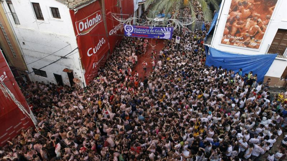 Fotogalerías Este artículo se publicó hace 10 años.La Tomatina en imágenesTamaño de letraColor de fondoComparteComentaPedro González de la Calleja31/08/2016 13:03-Actualizado a31/08/2016 18:21Tamaño de letraColor de fondoComparte0Comenta Miles de personas han acudido a celebrar la Tomatina en Buñol. EFE/Kai ForsterlingPublicidad Las calles de Buñol han quedado llenas de tomate. EFE Los participantes en la Tomatina de Buñol en plena batalla de tomates. REUTERS / Heino Kalis Buñol cumple con la tradición de más de siete décadas y celebra su internacional guerra del tomate,en la que miles de personas llegadas de todo el mundo se lanzan 160 toneladas de esta hortaliza para teñir de rojo el municipio y,en la edición de este año, reivindicar la lucha contra la violencia machista y la homofobia. EFE/ Kai Forsterling Participantes en la Tomatina de Buñol arrojan desde un camión tomates al resto de la gente. REUTERS/Heino KalisPublicidad Miles de personas se lanzan tomates en la tradicional celebración. EFE/Kai Forsterling La tradición, con más de siete décadas, celebra su internacional guerra del tomate. EFE Uno de los participantes en la Tomatina de Buñol, tumbado sobre la pulpa de tomate en la calle. REUTERS / Heino KalisPublicidad Los participantes en la Tomatina de Buñol en plena batalla de tomates. REUTERS / Heino Kalis 190 toneladas de tomate, el arsenal de esta edición. EFE Uno de los participantes en la batalla de tomates, conocida como la Tomatina, en la localidad valenciana de Buñol. REUTERS/Heino Kalis Buñol cumple con la tradición de más de siete décadas y celebra su internacional guerra del tomate, en la que miles de personas llegadas de todo el mundo se lanzan 160 toneladas de esta hortaliza para teñir de rojo el municipio y, en la edición de este año, reivindicar la lucha contra la violencia machista y la homofobia. EFE/ Kai Forsterling Buñol cumple con la tradición de más de siete décadas y celebra su internacional guerra del tomate,en la que miles de personas llegadas de todo el mundo se lanzan 160 toneladas de esta hortaliza para teñir de rojo el municipio y,en la edición de este año, reivindicar la lucha contra la violencia machista y la homofobia. EFE/ Kai ForsterlingPublicidad Buñol cumple con la tradición de más de siete décadas y celebra su internacional guerra del tomate,en la que miles de personas llegadas de todo el mundo se lanzan 160 toneladas de esta hortaliza para teñir de rojo el municipio y,en la edición de este año, reivindicar la lucha contra la violencia machista y la homofobia. EFE/ Kai Forsterling Buñol cumple con la tradición de más de siete décadas y celebra su internacional guerra del tomate,en la que miles de personas llegadas de todo el mundo se lanzan 160 toneladas de esta hortaliza para teñir de rojo el municipio y,en la edición de este año, reivindicar la lucha contra la violencia machista y la homofobia. EFE/ Kai ForsterlingPublicidad Buñol cumple con la tradición de más de siete décadas y celebra su internacional guerra del tomate,en la que miles de personas llegadas de todo el mundo se lanzan 160 toneladas de esta hortaliza para teñir de rojo el municipio y,en la edición de este año, reivindicar la lucha contra la violencia machista y la homofobia. EFE/ Kai Forsterling Buñol cumple con la tradición de más de siete décadas y celebra su internacional guerra del tomate,en la que miles de personas llegadas de todo el mundo se lanzan 160 toneladas de esta hortaliza para teñir de rojo el municipio y,en la edición de este año, reivindicar la lucha contra la violencia machista y la homofobia. EFE/ Kai ForsterlingComparteEtiquetasFiestas popularesTomatinaFiestasComentarios de nuestros socias/os¿Quieres comentar?Para ver los comentarios de nuestros socias y socios, primero tienes que iniciar sesión o registrarte. Escribe tu comentario Recuerda las normas de la comunidad.Enviar Descartar