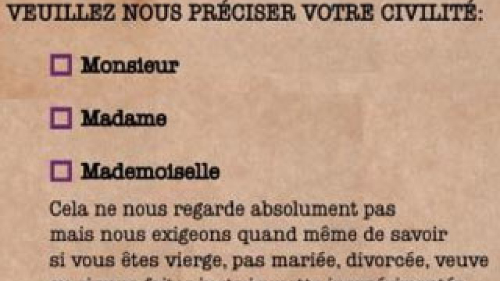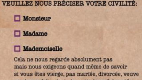 Asociaciones de feministas han lanzado una campaña para erradicar de los formularios oficiales y corporativos en Francia la casilla mademoiselle (señorita, en francés), por "atentar contra la vida privada de las mujeres", explicó hoy Agathe Paintaud, representante del colectivo Osez le féminisme. La casilla, de uso muy extendido en la administración aunque no obligatorio por ley, es "intrusiva" en la privacidad de las mujeres y revela de un trato "machista", alegó Paintaud, quien indicó que a los hombres "no se les pide que indiquen su estado civil".