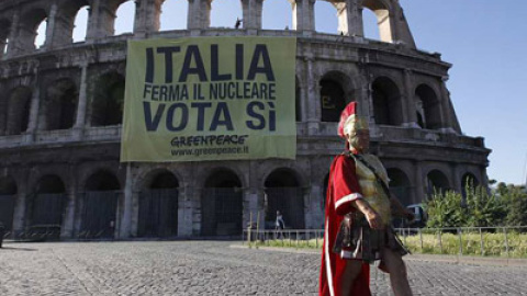 "Italia frena el nuclear, vota sí". El Coliseo ha amanecido este viernes con una gran pancarta colocada por un grupo de activistas de Greenpeace durante el último día de campaña por el referéndum que se celebra entre el domingo y el lunes y que, entre otras cosas, tiene como propósito paralizar la construcción de centrales nucleares en Italia.