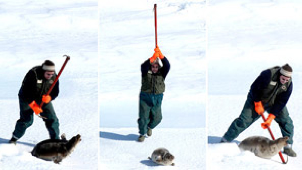 Cómo cazar una focaEl sistema empleado para cazar las focas es muy controvertido. Hay tres tipos de utensilios válidos legalmente. Un palo que debe cumplir unas determinadas dimensiones; un hakapik, herramienta con el mango de madera o metal que acaba en una punta metálica con forma curva, parecido al piolet de los escaladores; y con un arma de fuego.